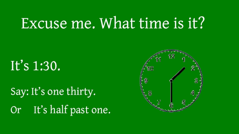 Excuse me. What time is it?It’s 1:30. Say: It’s one thirty.Or   It’s half past one.