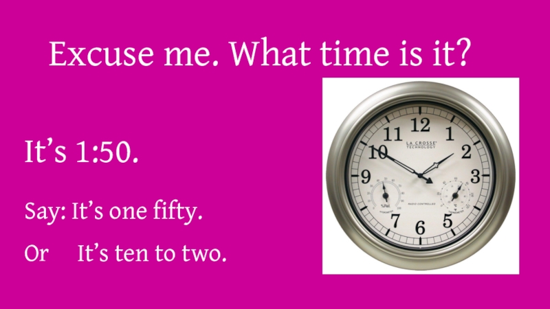 Excuse me. What time is it?It’s 1:50. Say: It’s one fifty.Or   It’s ten to two.