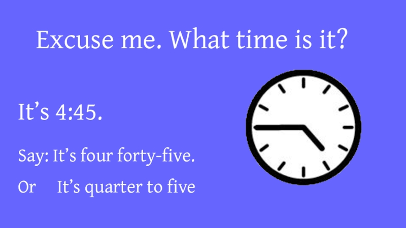 Excuse me. What time is it?It’s 4:45. Say: It’s four forty-five.Or   It’s quarter to five