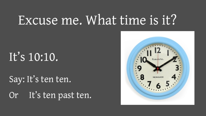 Excuse me. What time is it?It’s 10:10. Say: It’s ten ten.Or   It’s ten past ten.