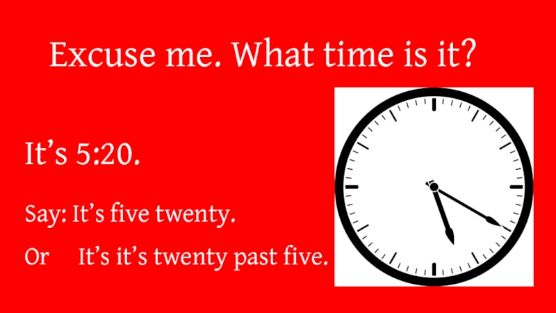 Excuse me. What time is it?It’s 5:20. Say: It’s five twenty.Or   It’s it’s twenty past