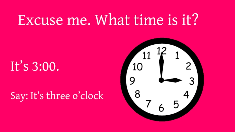Excuse me. What time is it?It’s 3:00. Say: It’s three o’clock