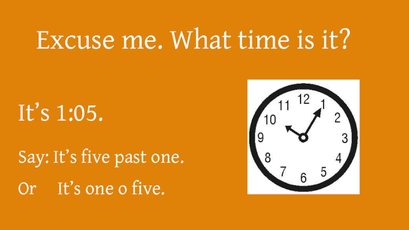 Excuse me. What time is it?It’s 1:05. Say: It’s five past one.Or   It’s one o