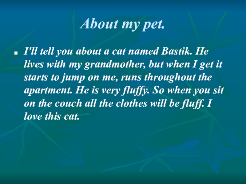 About my pet.I'll tell you about a cat named Bastik. He lives with my grandmother, but when