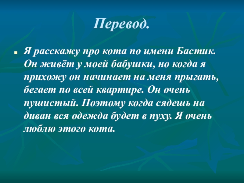 Перевод.Я расскажу про кота по имени Бастик. Он живёт у моей бабушки, но когда я прихожу он