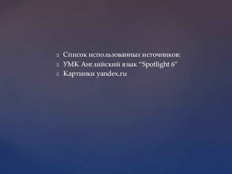 Список использованных источников:УМК Английский язык “Spotlight 6”Картинки yandex.ru