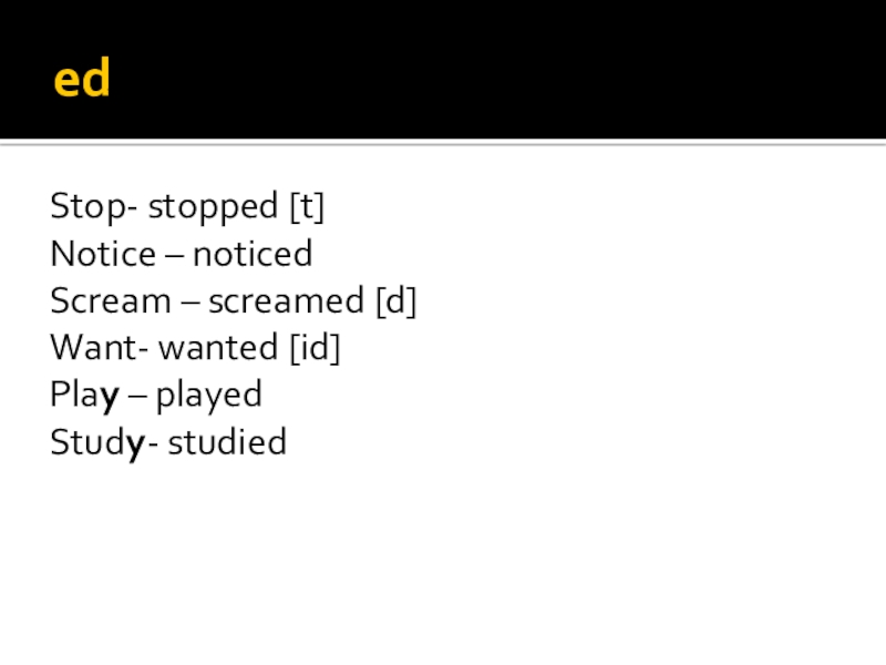 edStop- stopped [t]Notice – noticedScream – screamed [d]Want- wanted [id]Play – playedStudy- studied