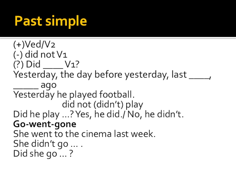 Past simple (+)Ved/V2(-) did not V1(?) Did ____ V1?Yesterday, the day before yesterday, last ____, _____ agoYesterday