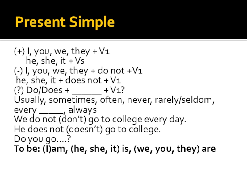 Present Simple(+) I, you, we, they + V1   he, she, it + Vs(-) I, you,