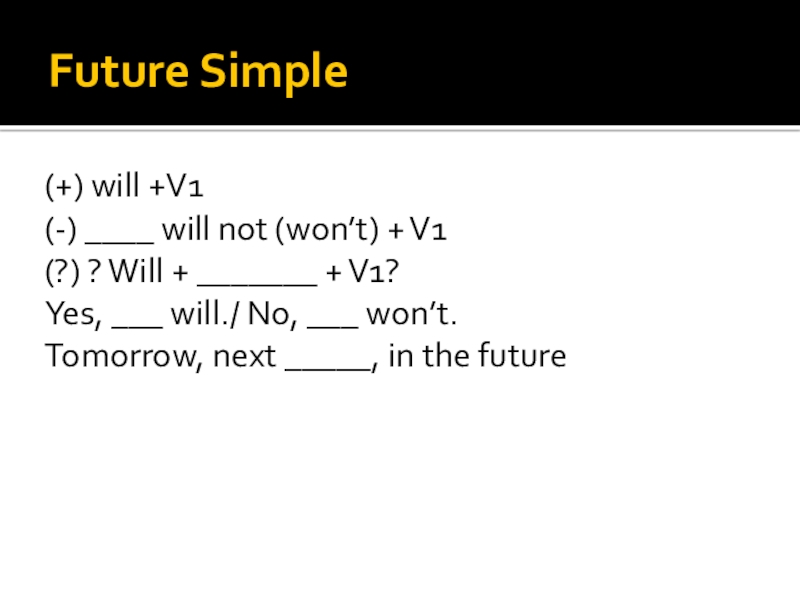Future Simple(+) will +V1(-) ____ will not (won’t) + V1(?) ? Will + _______ + V1?Yes, ___