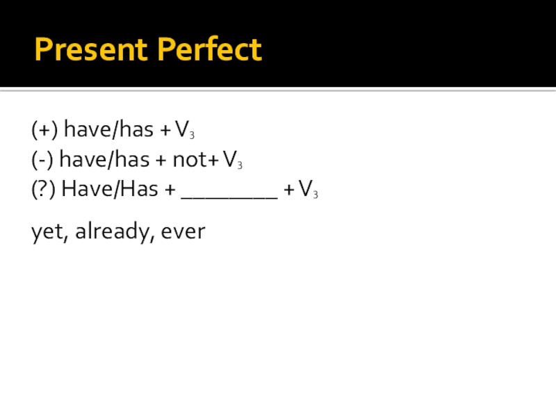 Present Perfect(+) have/has + V3(-) have/has + not+ V3(?) Have/Has + ________ + V3 yet, already, ever