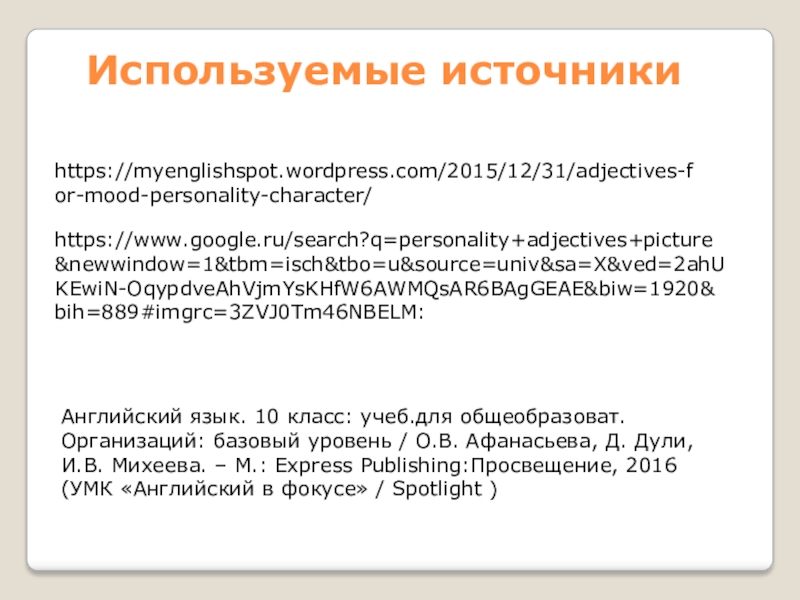 https://www.google.ru/search?q=personality+adjectives+picture&newwindow=1&tbm=isch&tbo=u&source=univ&sa=X&ved=2ahUKEwiN-OqypdveAhVjmYsKHfW6AWMQsAR6BAgGEAE&biw=1920&bih=889#imgrc=3ZVJ0Tm46NBELM:https://myenglishspot.wordpress.com/2015/12/31/adjectives-for-mood-personality-character/Используемые источникиАнглийский язык. 10 класс: учеб.для общеобразоват.Организаций: базовый уровень / О.В. Афанасьева, Д. Дули,И.В. Михеева. – М.: