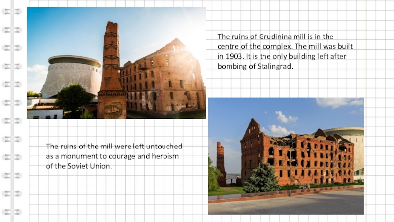 The ruins of the mill were left untouched as a monument to courage and heroism of the Soviet Union.
