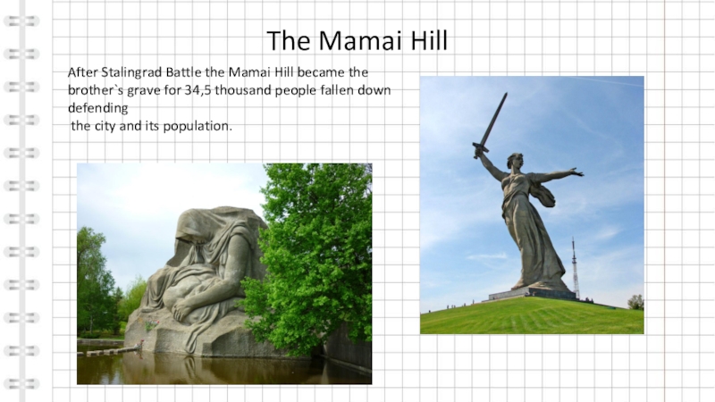 There is an introduction composition “Memory of generations” at the pedestal of the Mamai Hill. One can see a crowd of people who are going to honour the memory of the fallen fighters with wreaths and descended banners. A man and a small girl with a bunch of flowers are at the head of the column. He represents an old generation and she – the young one.