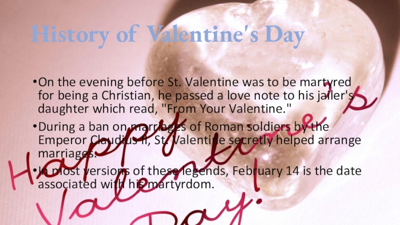 History of Valentine's DayOn the evening before St. Valentine was to be martyred for being a Christian,