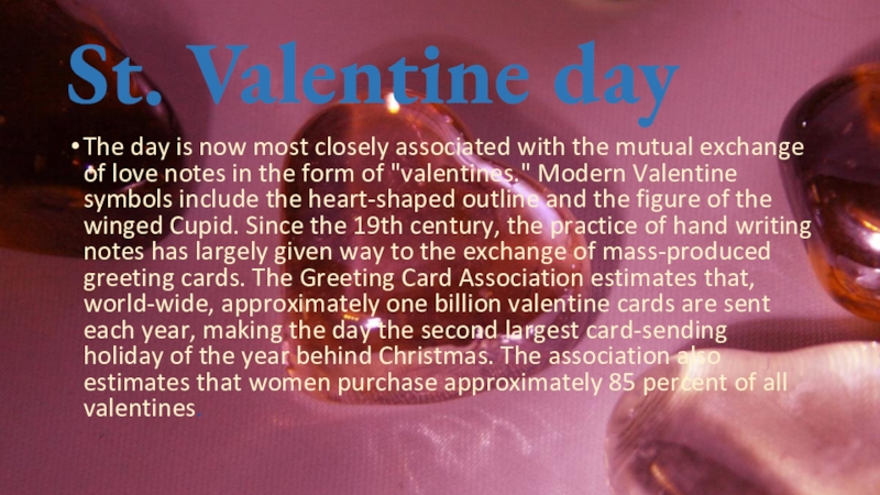 St. Valentine dayThe day is now most closely associated with the mutual exchange of love notes in
