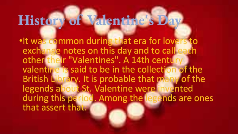 to exchange notes on this day and to call each other their "Valentines". A 14th century valentine is said to be in the collection of the British Library. It is probable that many of the legends about St. Valentine were invented during this period. Among the legends are ones that assert that: