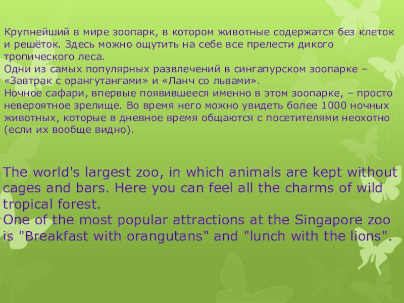 The world's largest zoo, in which animals are kept without cages and bars. Here you can feel all the charms of wild tropical forest.