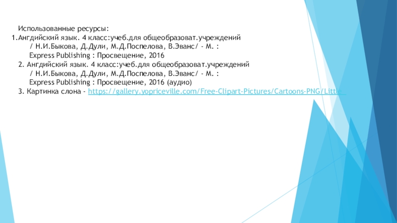 Использованные ресурсы:Aнгдийский язык. 4 класс:учеб.для общеобразоват.учреждений   / H.И.Быкова, Д.Дули, М.Д.Поспелова, В.Эванс/ - M. :