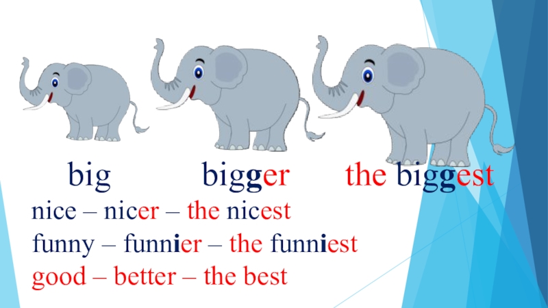 bigbiggerthe biggestnice – nicer – the nicestfunny – funnier – the funniestgood – better – the best