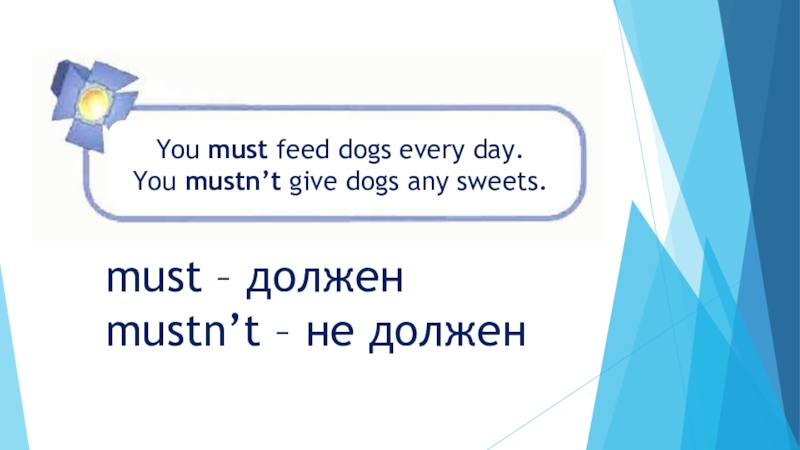 You must feed dogs every day.You mustn’t give dogs any sweets.must – долженmustn’t – не должен