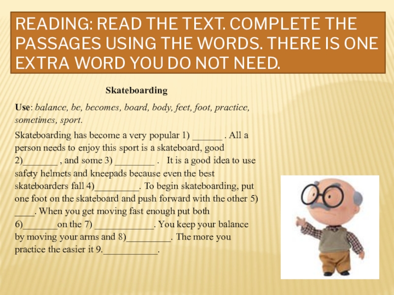 Reading: read the text. Complete the passages using the words. There is one extra word you do not need.