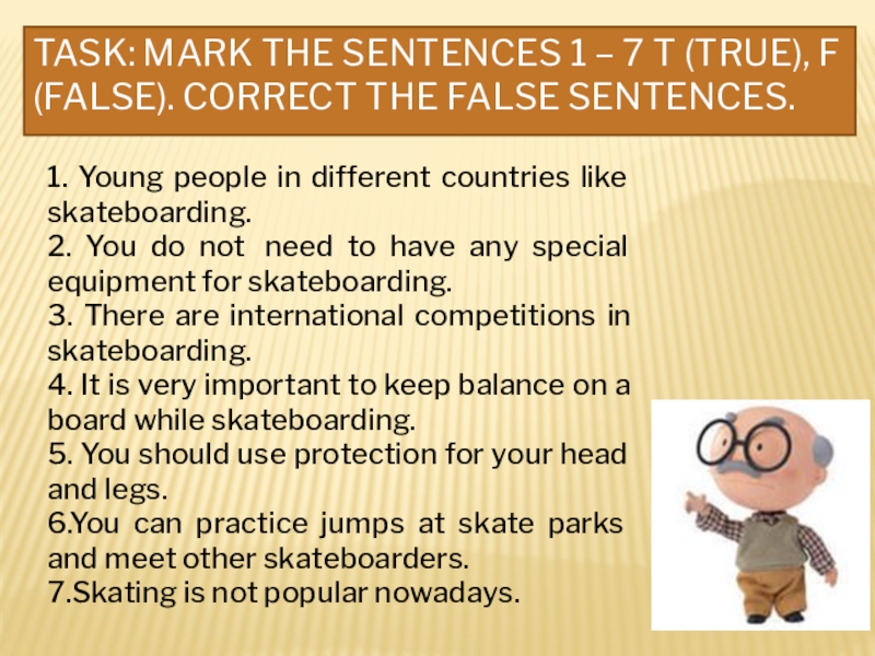 task: mark the sentences 1 – 7 T (true), f (false). Correct the false sentences.
