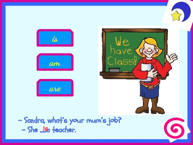 Sandra, what’s your mum’s job?- She ......a teacher.amisareis