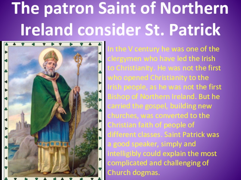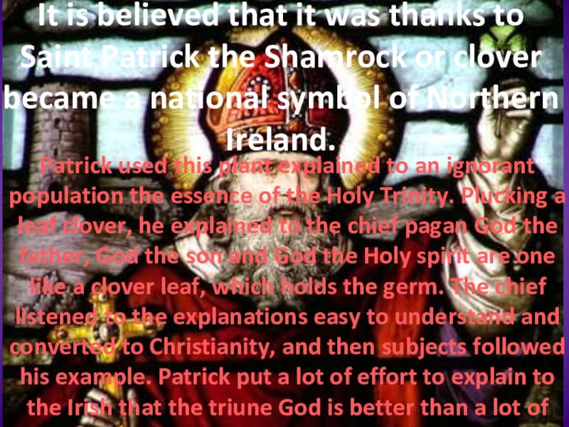 Patrick used this plant explained to an ignorant population the essence of the Holy Trinity. Plucking a leaf clover, he explained to the chief pagan God the father, God the son and God the Holy spirit are one like a clover leaf, which holds the germ. The chief listened to the explanations easy to understand and converted to Christianity, and then subjects followed his example. Patrick put a lot of effort to explain to the Irish that the triune God is better than a lot of pagan idols. Saint Patrick was a highly revered cleric. And after death was canonized and canonized.