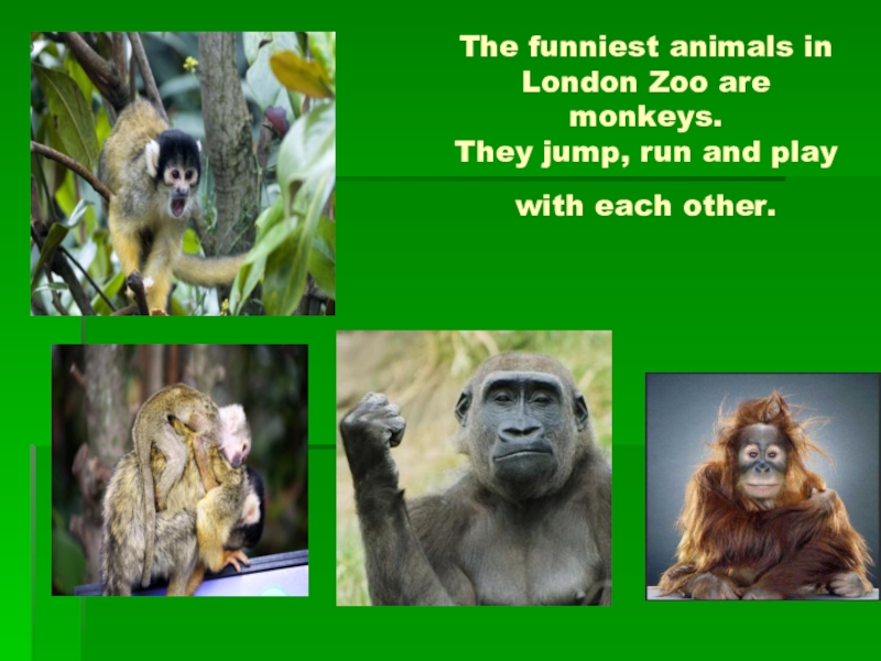 Слайд 11 The funniest animals in London Zoo are  monkeys. They jump, run