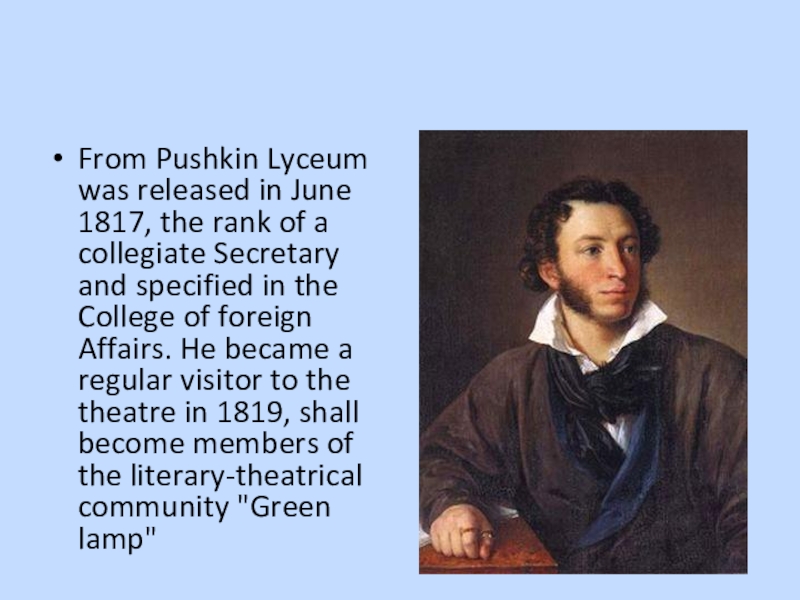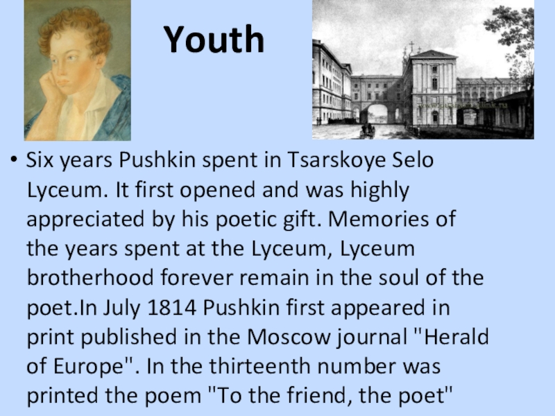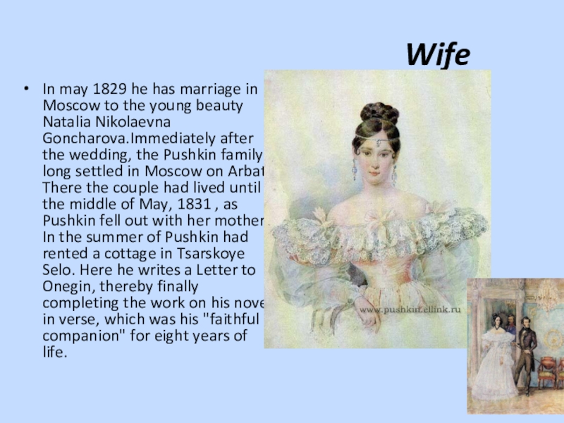In may 1829 he has marriage in Moscow to the young beauty Natalia Nikolaevna Goncharova.Immediately after the wedding, the Pushkin family long settled in Moscow on Arbat. There the couple had lived until the middle of May, 1831 , as Pushkin fell out with her mother.