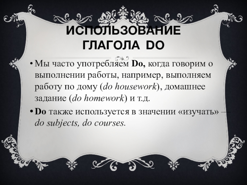 ИСПОЛЬЗОВАНИЕ ГЛАГОЛА  DO Мы часто употребляем Do, когда говорим о выполнении работы, например, выполняем работу по дому (do housework), домашнее