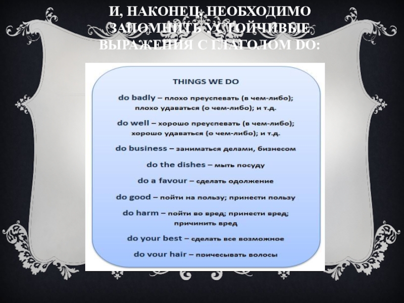 Слайд 5И, НАКОНЕЦ, НЕОБХОДИМО ЗАПОМНИТЬ УСТОЙЧИВЫЕ ВЫРАЖЕНИЯ С ГЛАГОЛОМ DO: