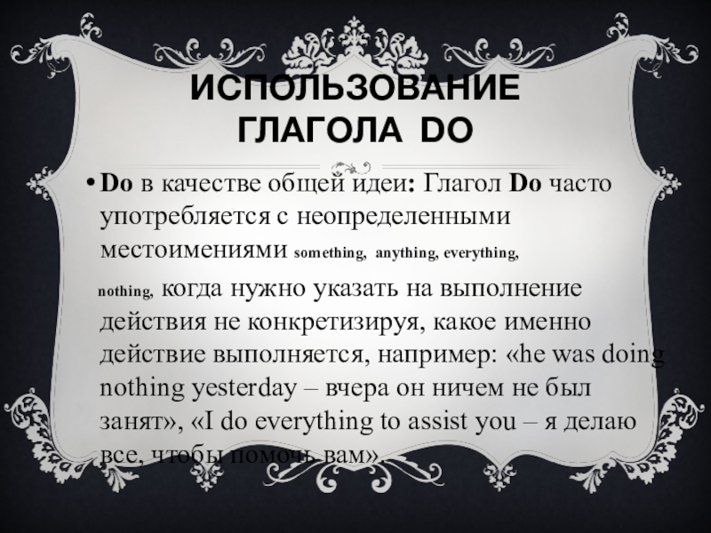 ИСПОЛЬЗОВАНИЕ ГЛАГОЛА  DO Do в качестве общей идеи: Глагол Do часто употребляется с неопределенными местоимениями something,  anything, everything,    nothing, когда нужно указать на