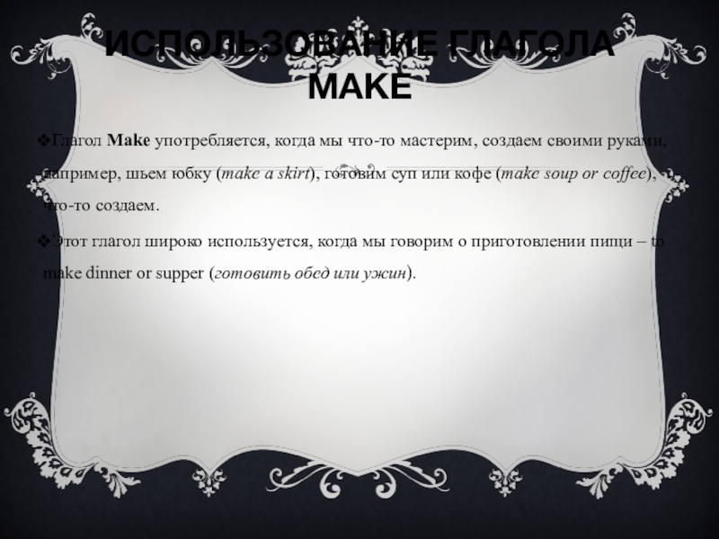ИСПОЛЬЗОВАНИЕ ГЛАГОЛА  MAKEГлагол Make употребляется, когда мы что-то мастерим, создаем своими руками, например, шьем юбку (make a skirt), готовим суп или