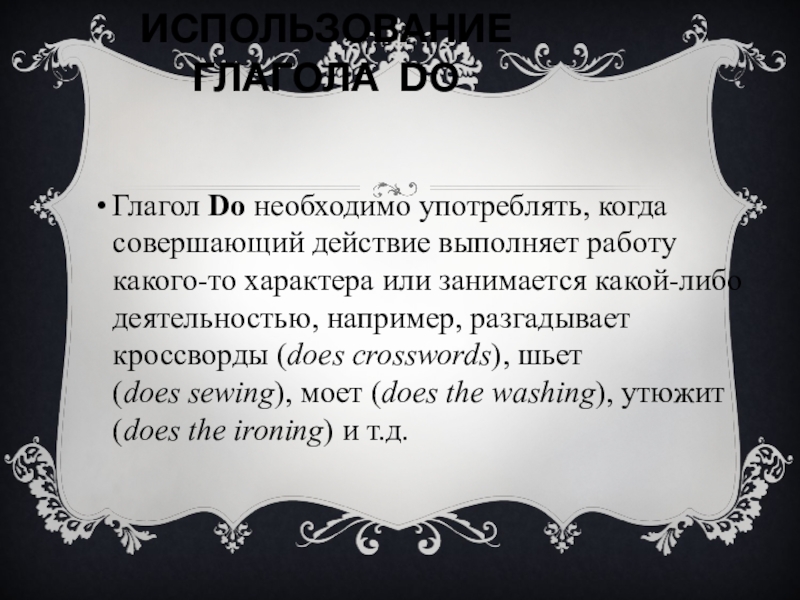 ИСПОЛЬЗОВАНИЕ ГЛАГОЛА  DO Глагол Do необходимо употреблять, когда совершающий действие выполняет работу какого-то характера или занимается какой-либо деятельностью, например, разгадывает кроссворды (does crosswords), шьет (does sewing), моет (does the washing), утюжит (does the ironing) и т.д.