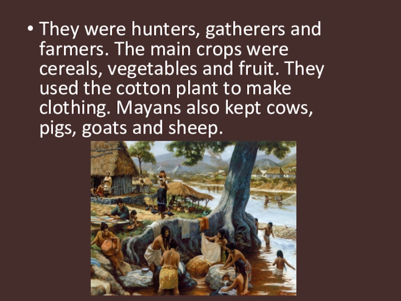 Слайд 14They were hunters, gatherers and farmers. The main crops were cereals,