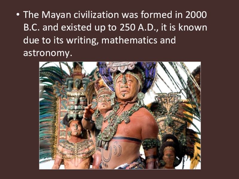 Слайд 6The Mayan civilization was formed in 2000 B.C. and existed up