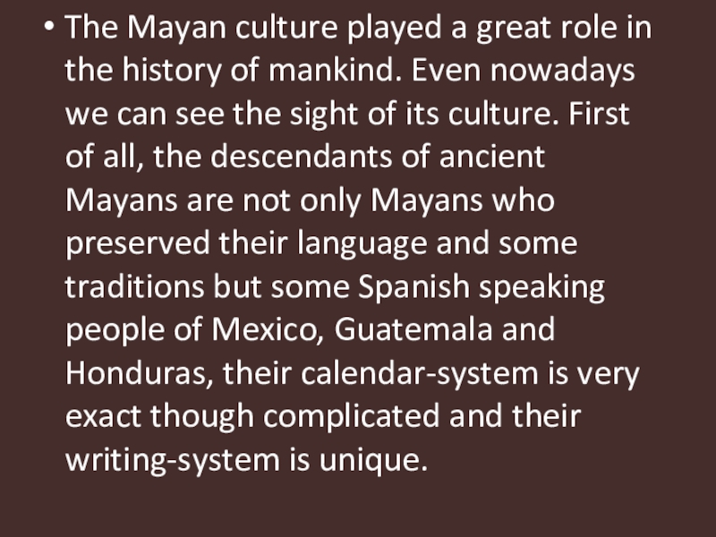 mankind. Even nowadays we can see the sight of its culture. First of all, the descendants of ancient Mayans are not only Mayans who preserved their language and some traditions but some Spanish speaking people of Mexico, Guatemala and Honduras, their calendar-system is very exact though complicated and their writing-system is unique.