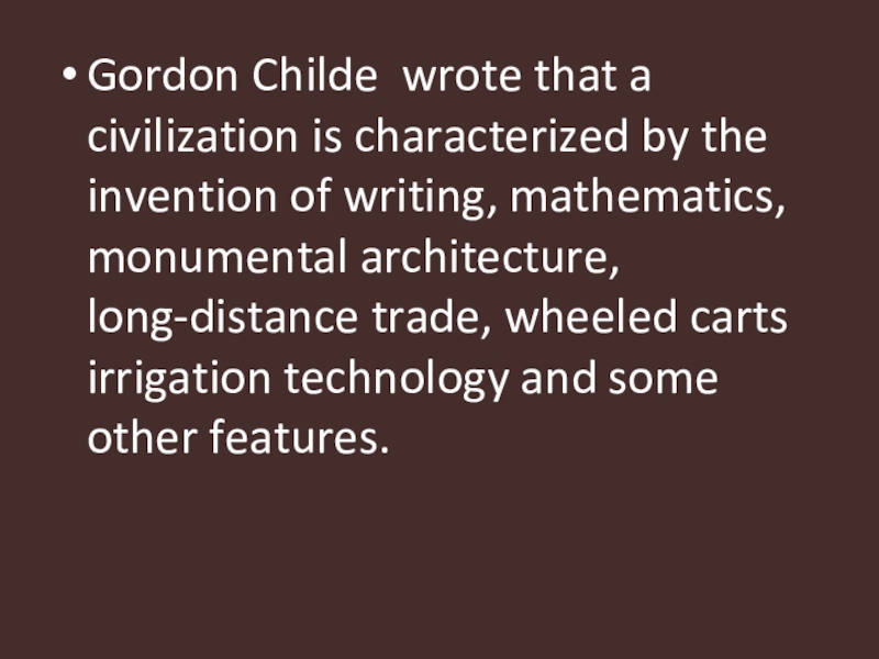 Слайд 4Gordon Childe wrote that a civilization is characterized by the invention