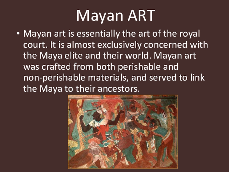It is almost exclusively concerned with the Maya elite and their world. Mayan art was crafted from both perishable and non-perishable materials, and served to link the Maya to their ancestors.