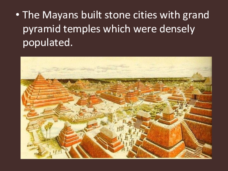 Слайд 10The Mayans built stone cities with grand pyramid temples which were