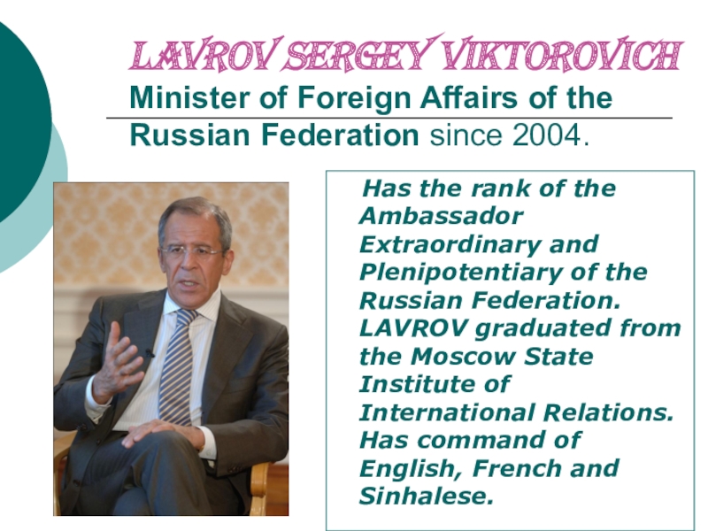 Has the rank of the Ambassador Extraordinary and Plenipotentiary of the Russian Federation. LAVROV graduated from the Moscow State Institute of International Relations. Has command of English, French and Sinhalese.