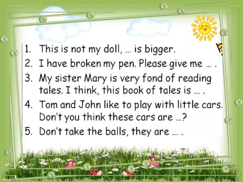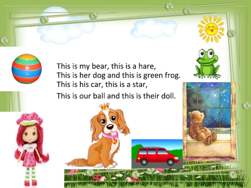 This is my bear, this is a hare, This is her dog and this is green frog. This is his car, this is a star, This is our ball and this is their doll.