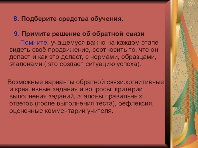 Возможные варианты обратной связи:когнитивные и креативные задания и вопросы, критерии выполнения заданий, эталоны правильных ответов (после выполнения теста), рефлексия, оценочные комментарии учителя.