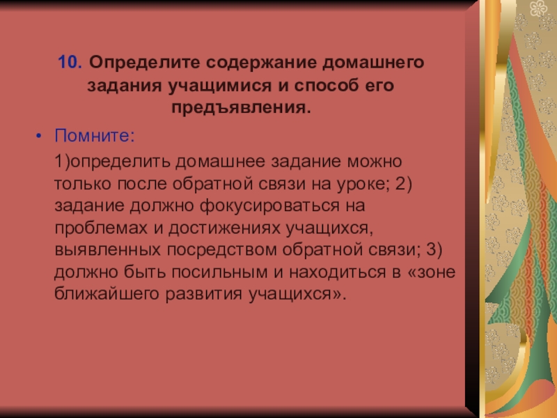 10. Определите содержание домашнего задания учащимися и способ его предъявления.