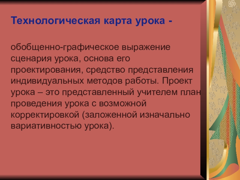 проектирования, средство представления индивидуальных методов работы. Проект урока – это представленный учителем план проведения урока с возможной корректировкой (заложенной изначально вариативностью урока).