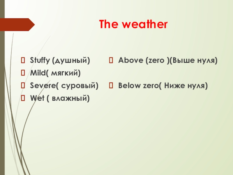 The weather Stuffy (душный)Mild( мягкий)Severe( суровый)Wet ( влажный)Above (zero )(Выше нуля)Below zero( Ниже нуля)