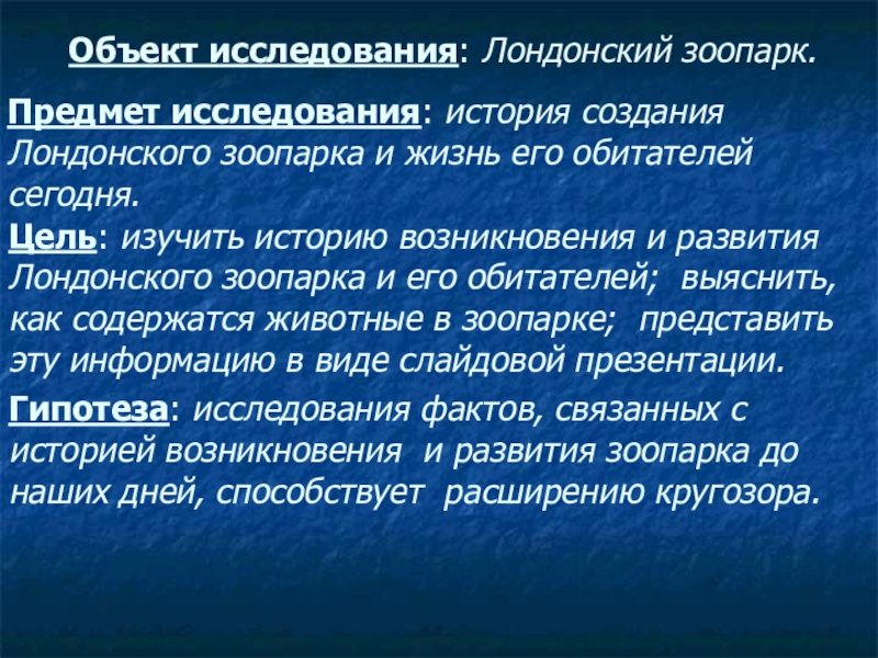 Предмет исследования: история создания Лондонского зоопарка и жизнь его обитателей сегодня.