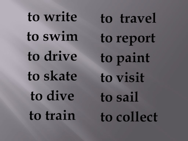 to writeto swimto driveto skateto diveto trainto travelto reportto paintto visitto sailto collect